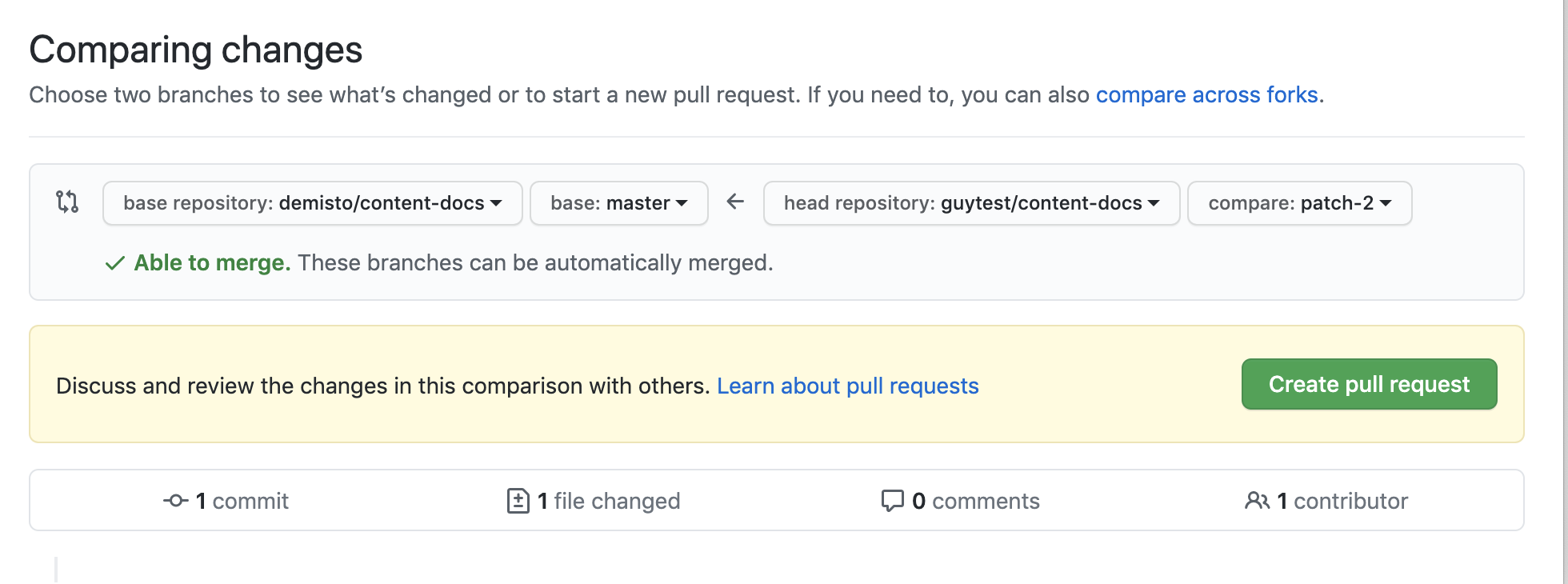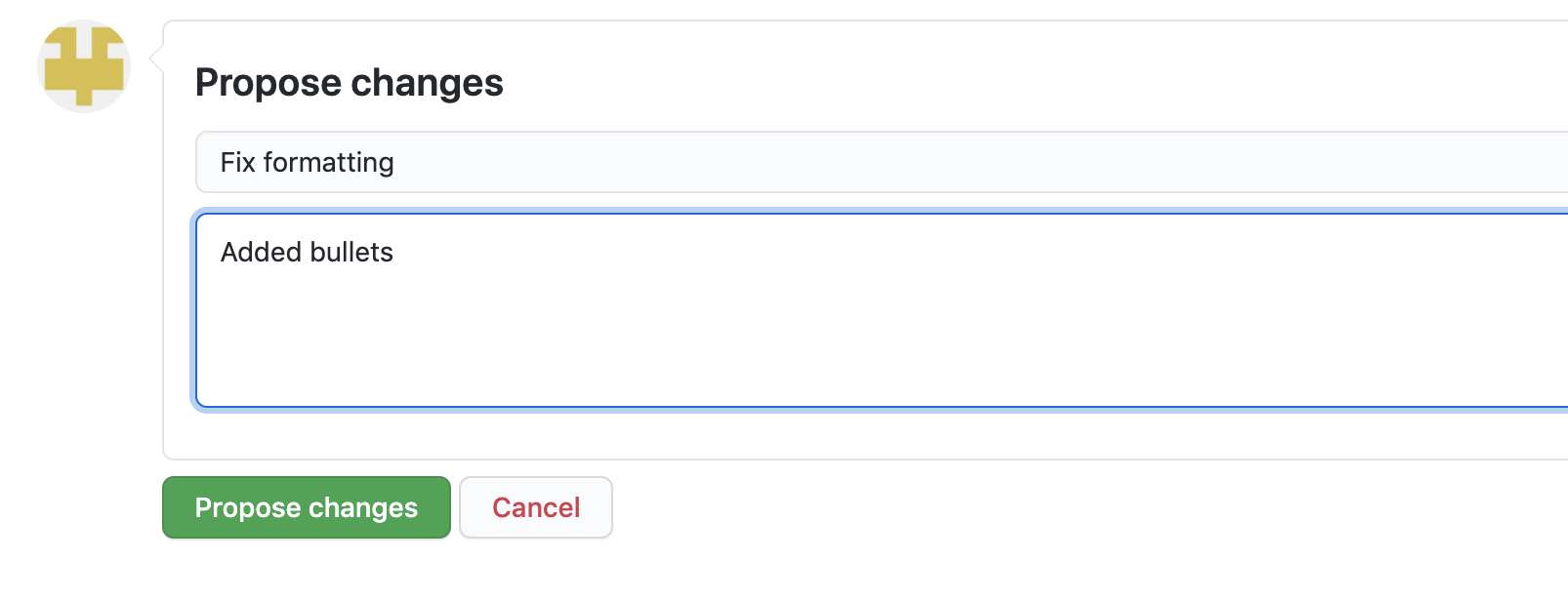 Propose changes. You will be taken to a new page:Comparing changes. In this page you will be able to compare your changes and create a pull request. Click theCreate pull requestbutton.