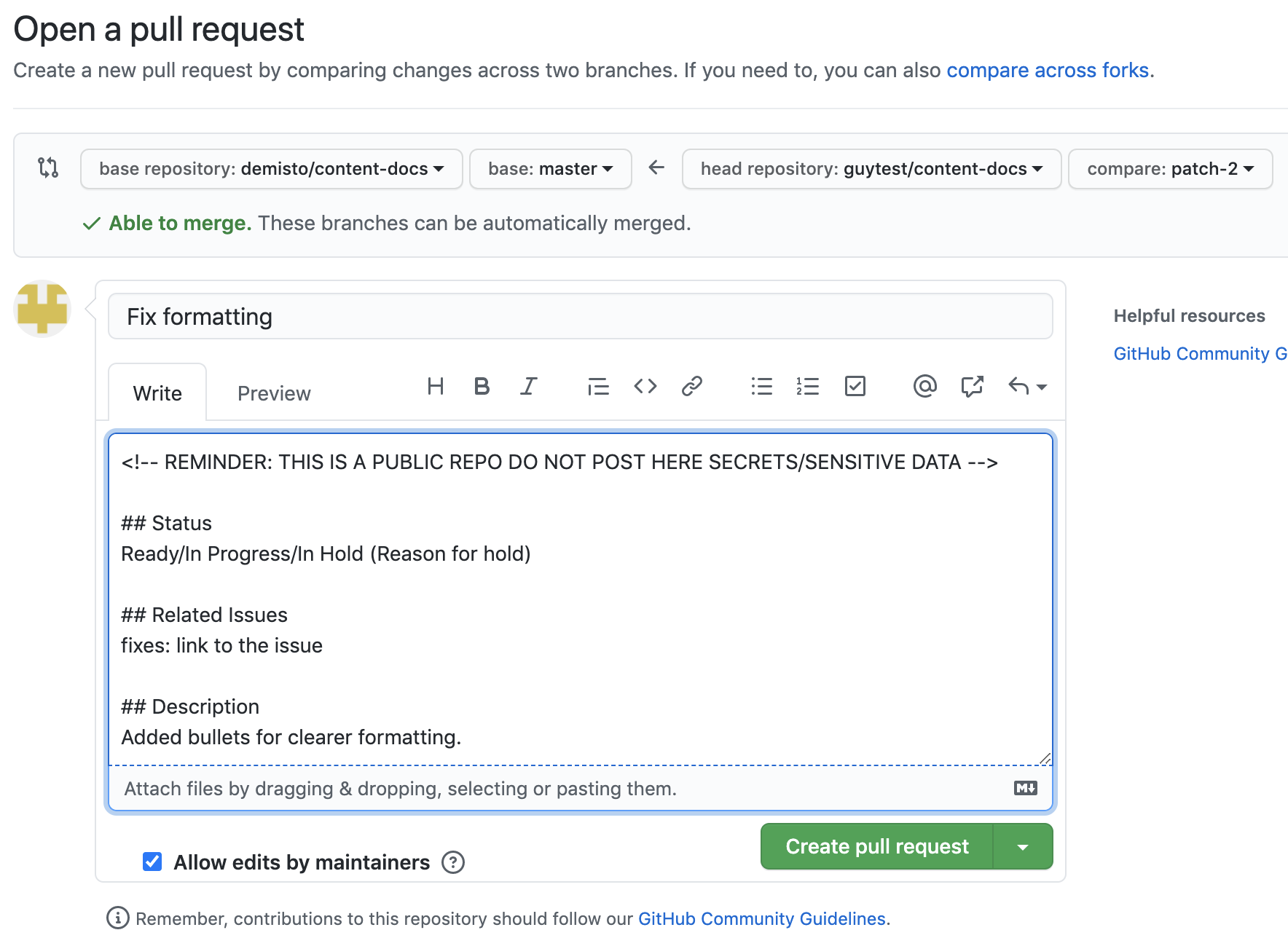 Open a pull request. Edit the title for the pull request and fill out the description of the PR. ClickCreate pull request.