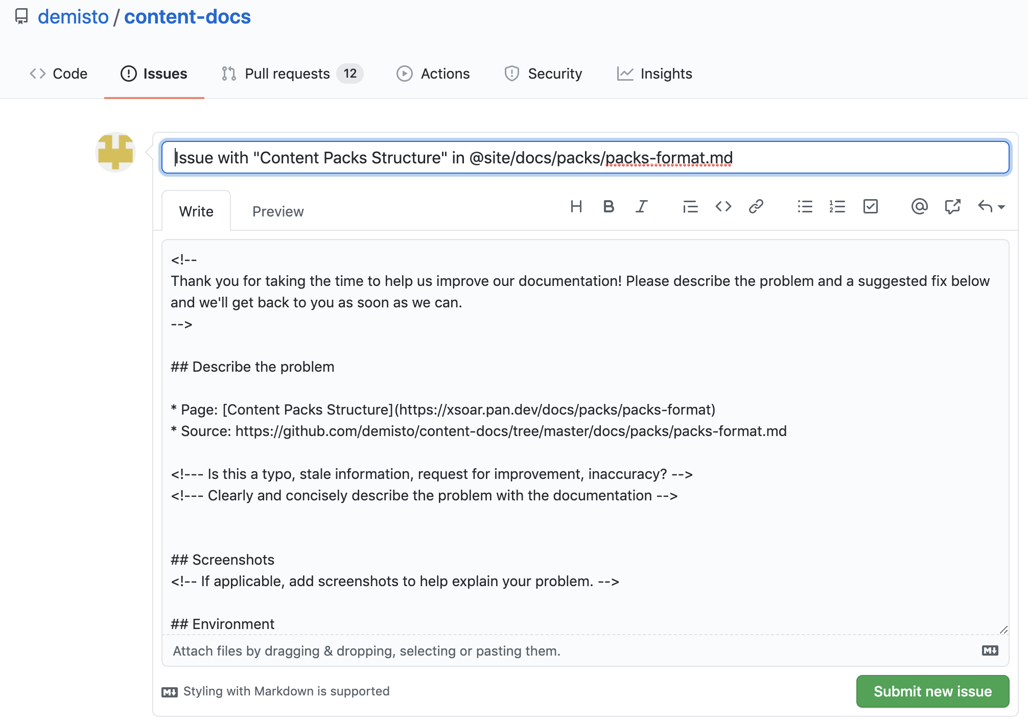 Report an issuebutton is clicked, a new windows from GitHub will open up. The window will contain GitHub's issue form. Make sure to fill out the issue template with a clear and concise description. If applicable, include screenshots to help explain the issue you encountered. ClickSubmit new issue.
