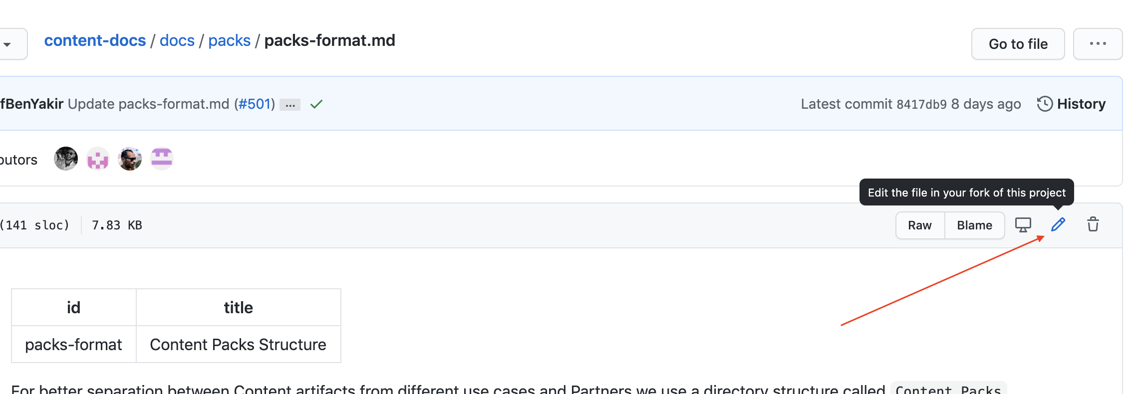 Edit this pagelink is clicked, a new window from GitHub will open up. The window will contain the page in markdown view with an option to edit the page. Click thePencilicon to start editing the page.
