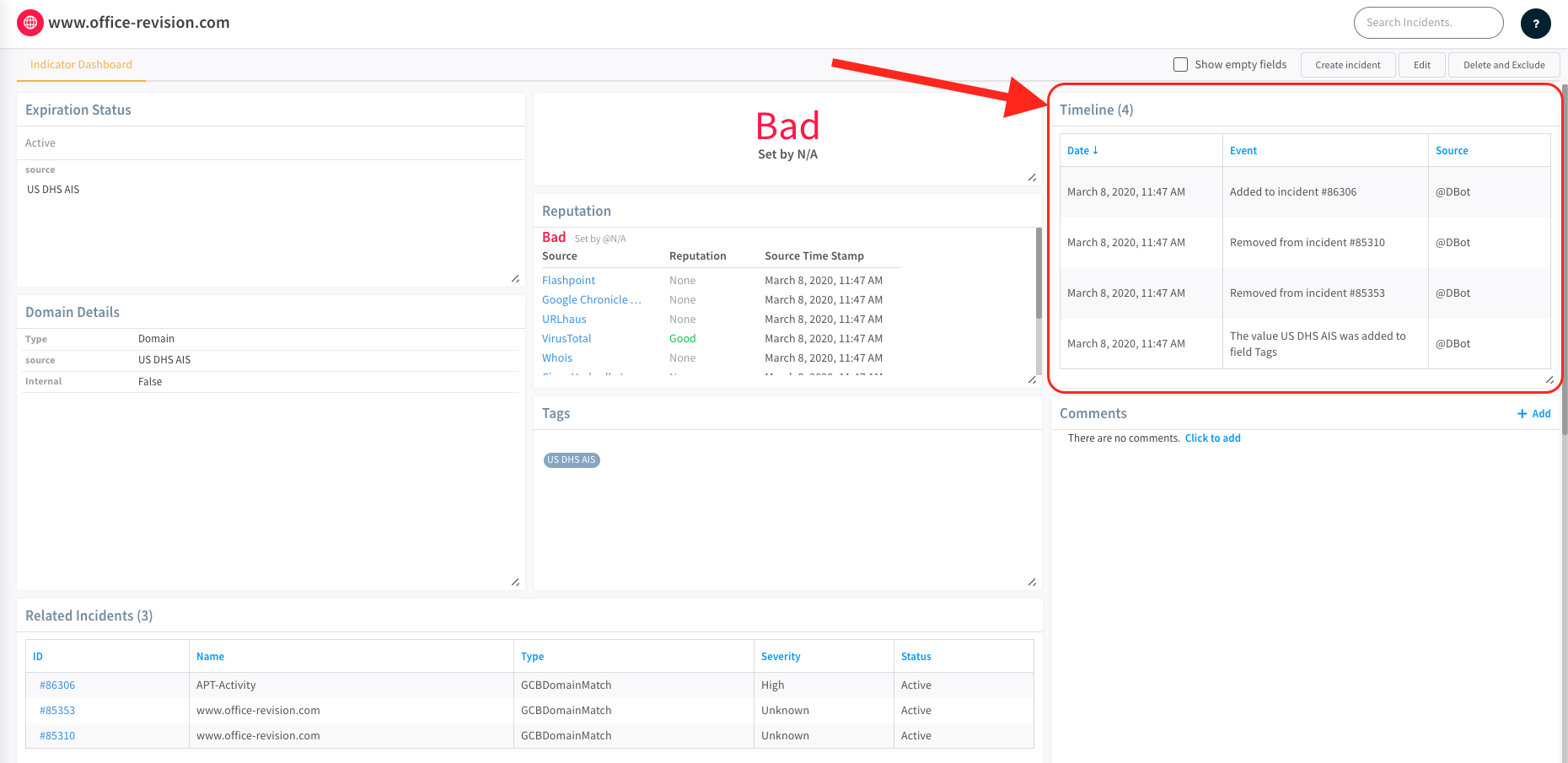 When IndicatorTimeline data is returned in an entry, the timeline section of the indicator whose value was noted in the timeline data will be updated (and is viewable in the indicator's view page in Cortex XSOAR as can be seen in the attached image).