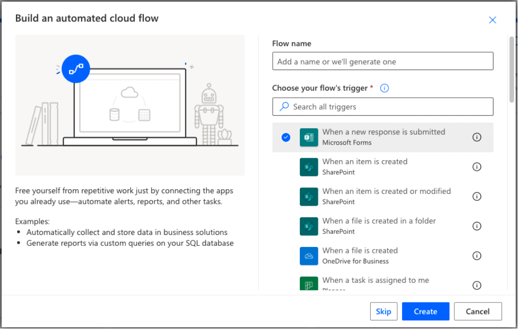 Enter a name for your form. For the trigger, select When a new response is submitted (Microsoft Forms).