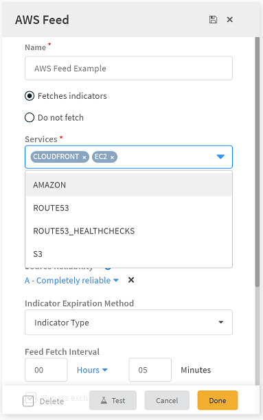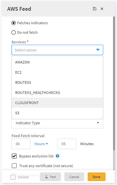 Now, both CLOUDFRONT and EC2 are selected for this instance. Click Done and this AWS Feed integration instance will now fetch indicators from AWS's CLOUDFRONT and EC2 feeds.