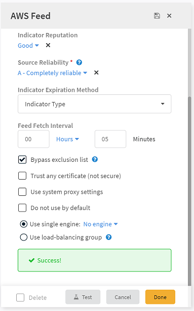 Notice that there is also a multi-select parameter, Regions. We could configure this parameter if we wanted to filter indicators returned by this AWS Feed integration instance by their associated region data field. For our example, we are returning indicators from all regions, so we do not need to change this parameter. And as easy as that, we've finished configuring an instance. Let's make sure that everything is working properly by clicking the Test button at the bottom of the configuration panel. If everything is working as expected, a green 'Success!' message will appear at the bottom of the configuration panel, as shown in the screenshot below.