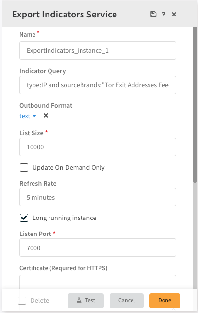 In Cortex XSOAR the data flow is based on two integration types: feed integrations and outbound integrations. Cortex XSOAR provides dedicated out-of-the-box feed integrations for many feed sources, as well as generic feed integrations that you can configure to work with many feed sources. In MineMeld, the outputs of a miner node (the indicators fetched from a feed source) need to be specified as the input of other node(s). However, in Cortex XSOAR, all indicators fetched from feed integrations flow into the Cortex XSOAR instance's indicator store. Since the Cortex XSOAR indicator store already supports the mechanism of searching and filtering indicators, we are able to condense what in MineMeld was the flow of indicators into a processor node and then an output node. We do this by configuring a single instance of the Export Indicators Service integration. When configuring an instance of the Export Indicators Service integration, we can enter an indicator query (using the query syntax you would use to search and filter indicators in the Indicators page of the Cortex XSOAR platform), which determines the indicators that will be made available from this integration instance for external consumption.