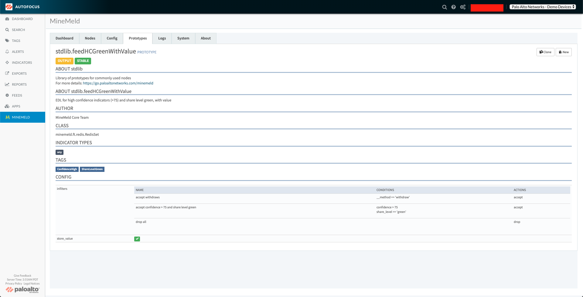You can output indicators with Cortex XSOAR by using two integrations, Palo Alto Networks PAN-OS EDL Service and Export Indicators Service. Migrating MineMeld output nodes to Cortex XSOAR is a process that requires looking at the prototype of a given output node, as well as the prototypes of all of the nodes that flow into that output node. We need to do this to understand how to construct the query we will enter when configuring an instance of the Palo Alto Networks PAN-OS EDL Service or Export Indicators Service integration.