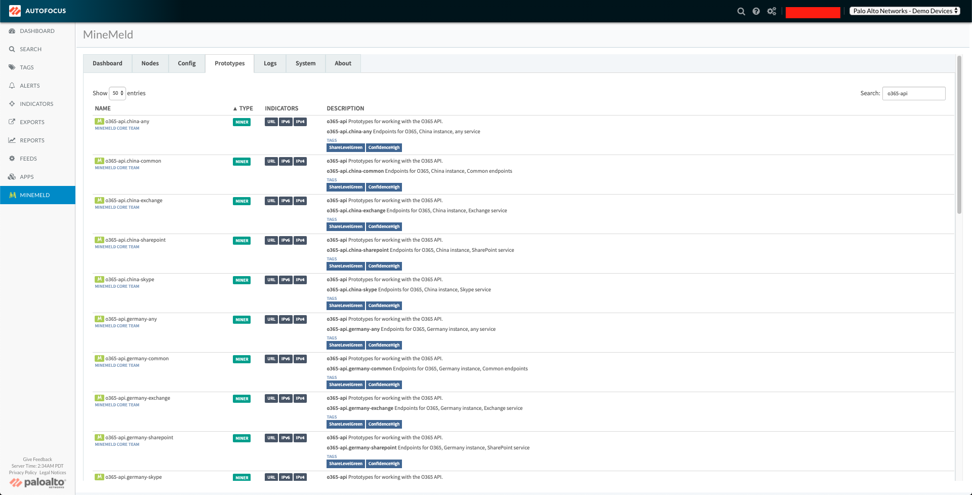 There is a node named allow-multi_o365-worldwide-any that uses the prototype o365-api.worldwide-any. The o365-api prototypes appear in the AutoFocus-hosted MineMeld UI.