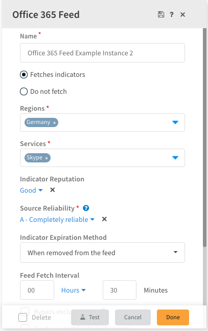 As you can see in the screenshot above, Cortex XSOAR provides default values for many of the configuration parameters, as determined by the source of the feed. To configure the integration instance to fetch from the same source as the MineMeld node we are migrating from, we do not need to make any adjustments because the default values for the Regions and Services configuration parameters are Worldwide and All respectively, which are the values we need to migrate this particular prototype.