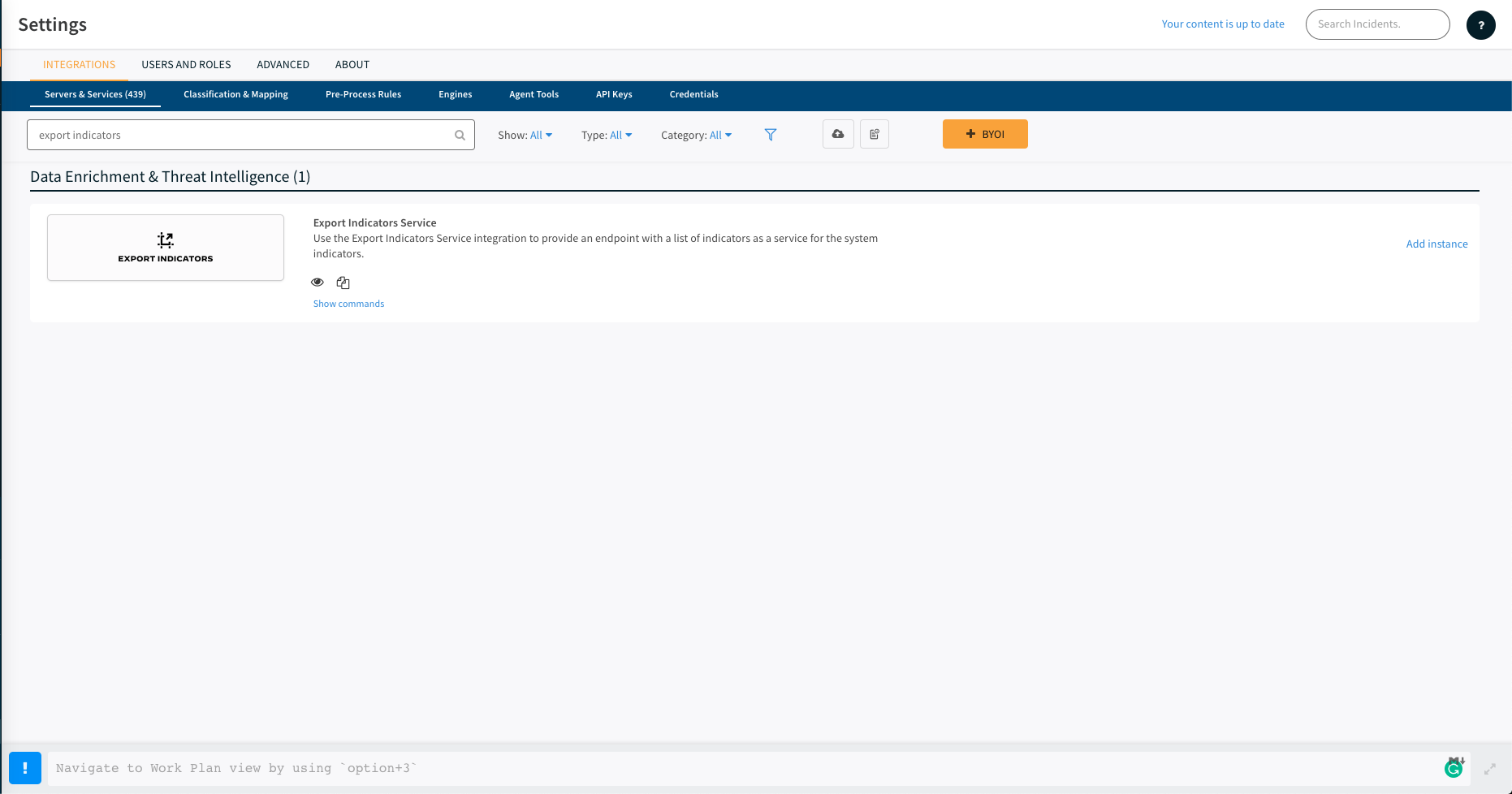 Let's configure an instance of the Export Indicators Service integration using the information we collected to construct the query that defines which indicators are made available. Search for 'export indicators' in your Cortex XSOAR's integrations page as seen in the following screenshot.