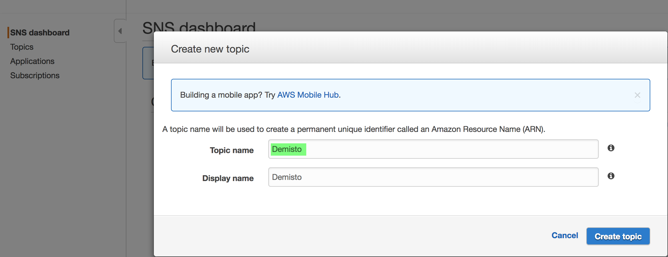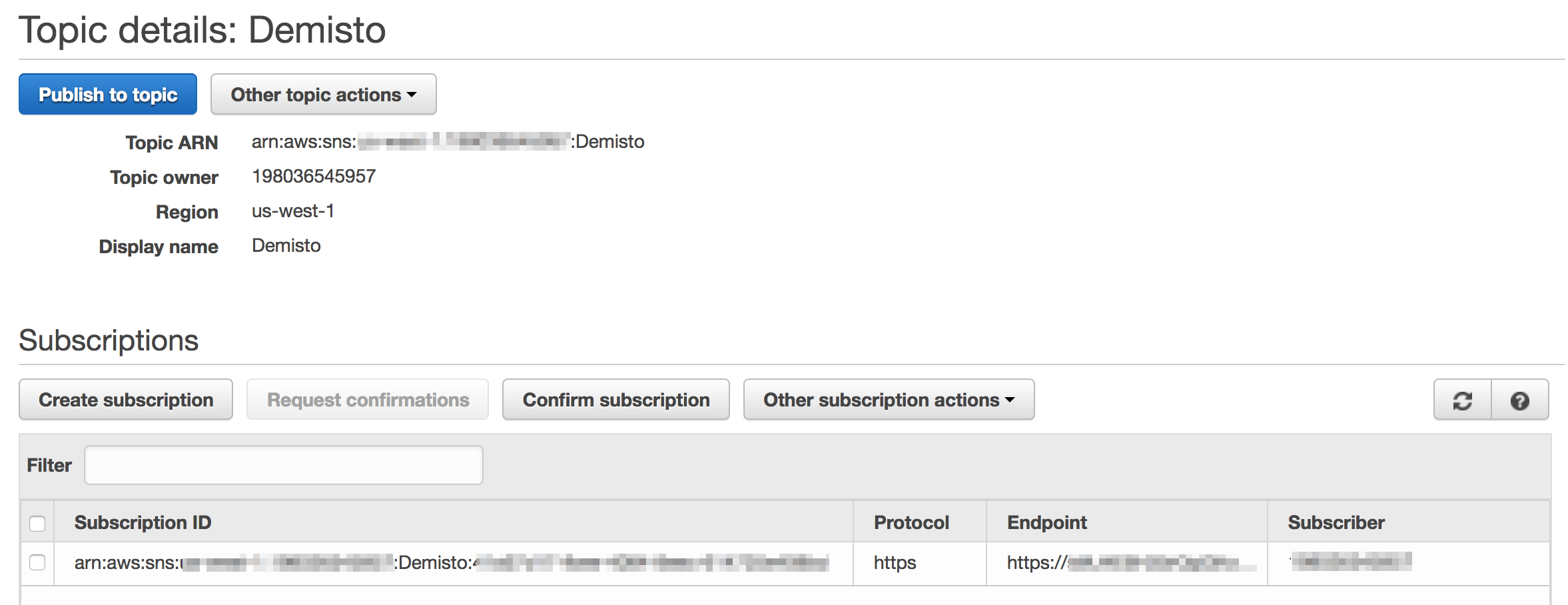 • In the Endpoint field, type the following URL with your server details: [https://<demisto-api-key>@<demisto-server-url>/incident/aws/sns](https://@/incidents/aws/sns)To create the Demisto API key, navigate to Settings > Integrations > API Keys.
