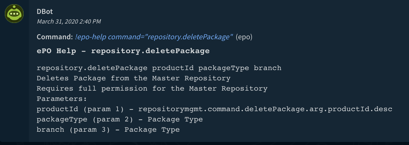 | command | The command to execute. Run either the core.help command or the !epo-help to get all available commands. | Required |