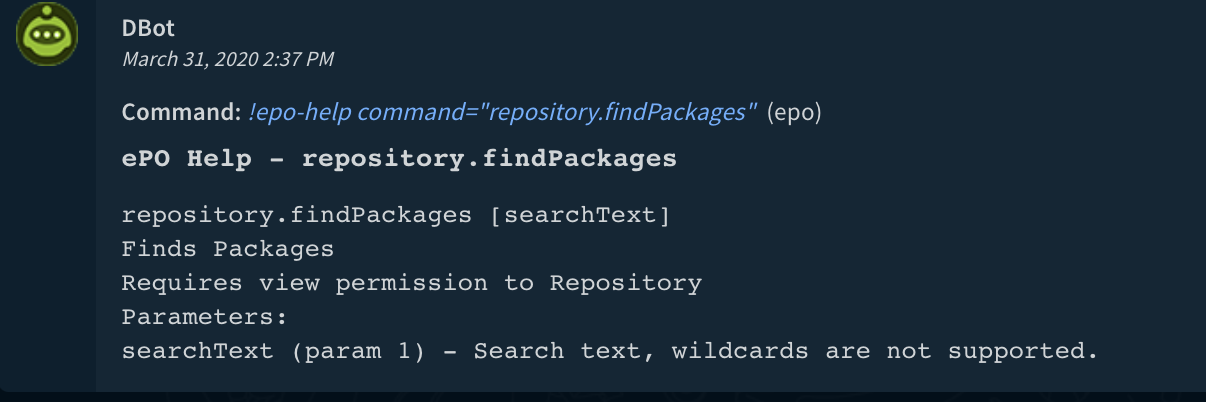 To get a list of available commands, run the ''epo-help'' command to get a list of available commands. You can also specify the ''headers'' argument to filter table headers. Example/:/ !epo-command command=system.find searchText=10.0.0.1 headers=EPOBranchNode.AutoID,EPOComputerProperties.ComputerName