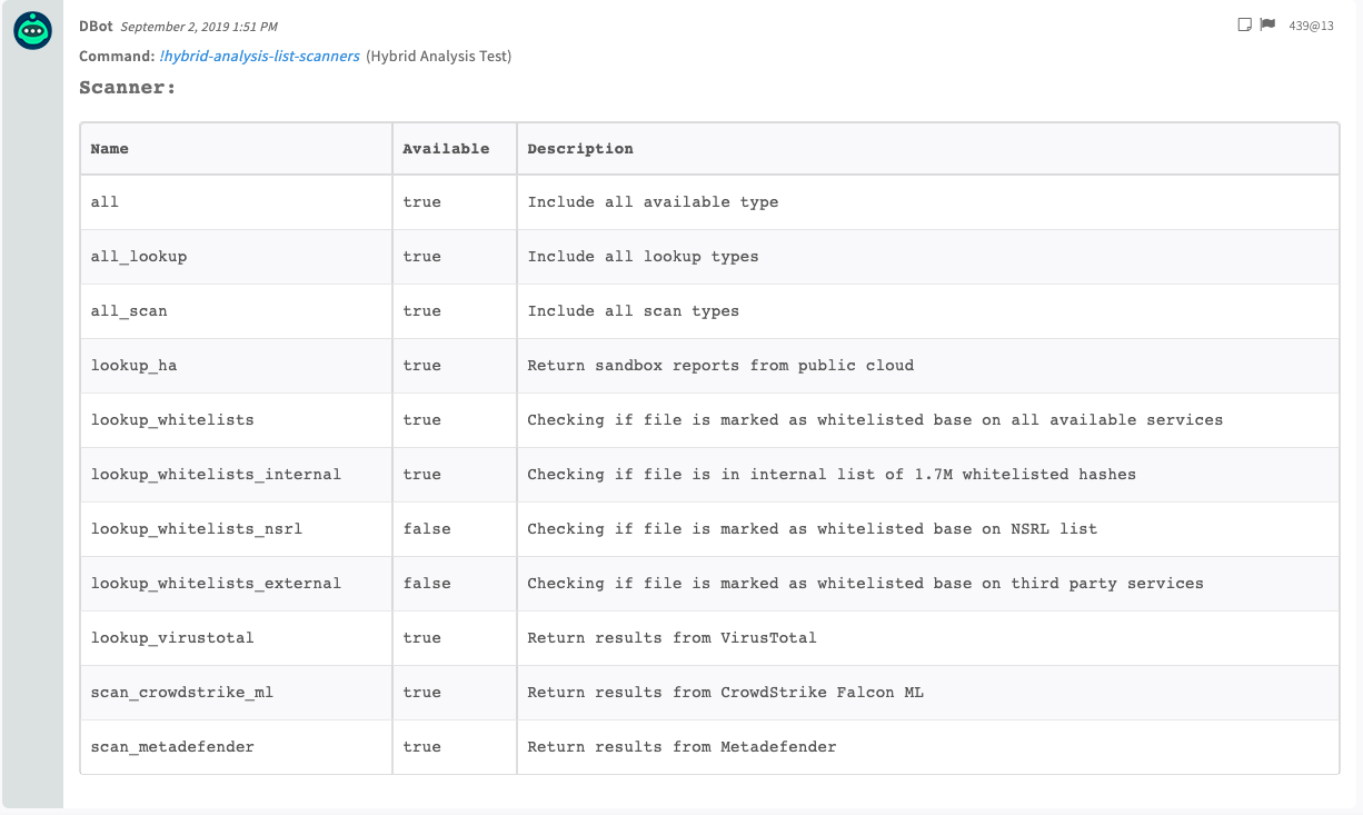 - Get a list of scanners: hybrid-analysis-list-scanners
