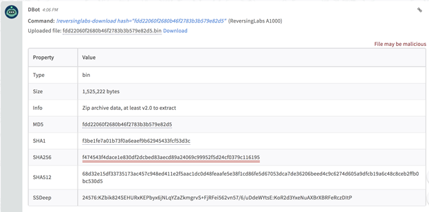 Download a sample to the investigation: reversinglabs-download